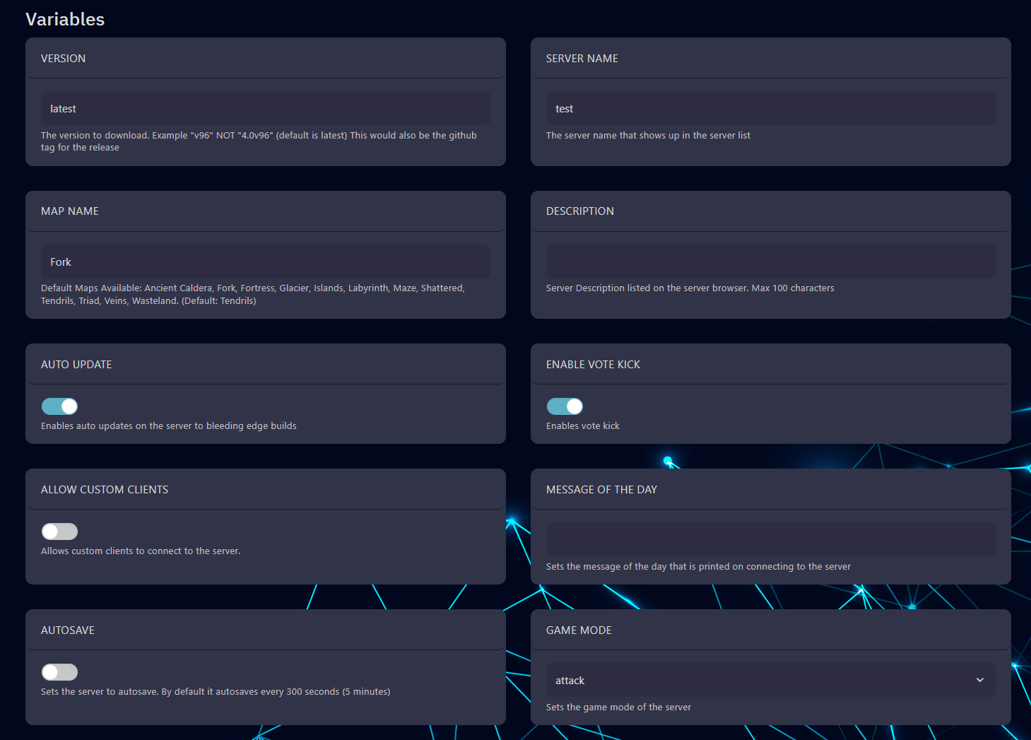 Now that you have a Mindustry server, you can configure it to play exactly how you want. Most of the configuration of the server can be easily done in the Startup section of the AleForge Panel