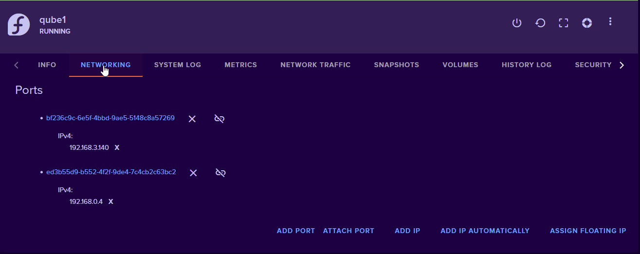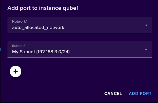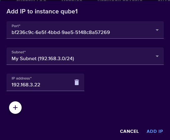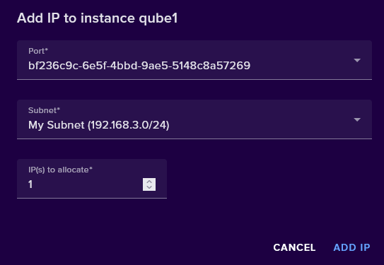 Select the network and subnet for your port to exist on. If you’d like to manually assign an IP address to your port, you can do so by clicking the white plus icon and entering in an IP address. Click Add Port and your port will begin being constructed and assigned to your Qube.