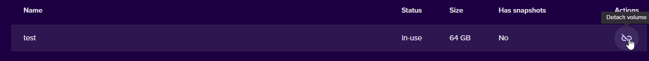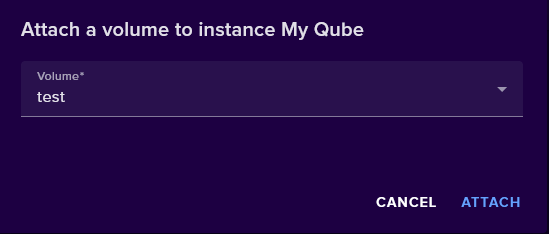 Click Attach and your volume will begin attaching to your Qube. Once your volume is attached, you can detach the volume by clicking the chain with a cross through it.
