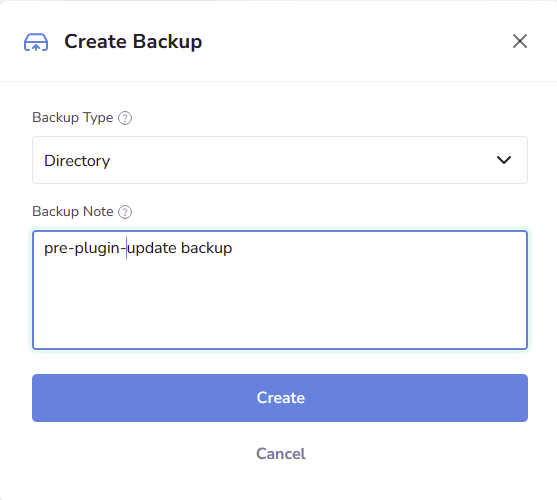 - From the form that appears, select the type of backup you would like to make, and optionally give a note as to what that backup is for