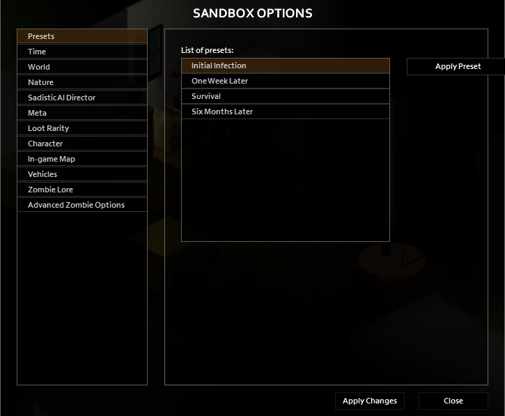 | Preset | Resources | Zombie Speed | Zombie Senses | Horde Size | Utility Shut-Off |