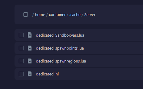 dedicated.ini: Config for controlling things such as Public Server Name and moreSandboxVars.lua: This file is used to control game state items such as the number of zombies, perk points, etc…spawnpoints.lua: You can use this file to set up the locations players are allowed to spawn into the world. Check out our guide for custom spawn points.spawnregions.lua: This file dictates what regions exist in your world. If you have added custom maps, this file should be updated automatically