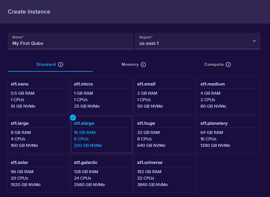 You can create a Qube by going to Cloud -> Qubes in the panel. Click the plus icon in the bottom right.