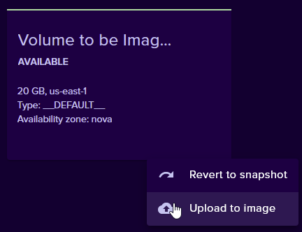 To create an image from a volume, first ensure you have a volume with the data you want as part of the image. Next, go to Cloud -> Volumes. Click the three dots and click “Upload to image”.