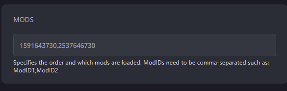 ?GameModIds=<mod1ID>,<mod2ID>,<mod3ID> - Restart your server and it will have the appropriate mods installed