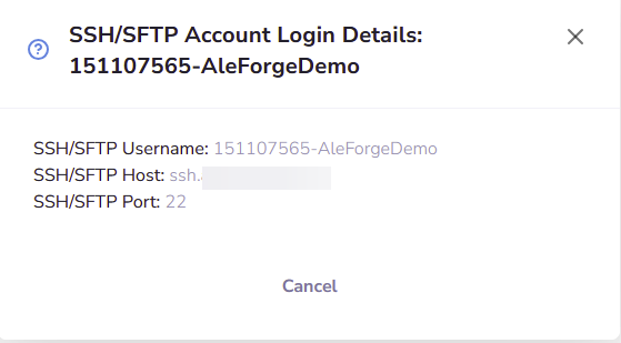 - You will be provided with a window showing you the address of your server and the port to use in the SFTP client of your choice
