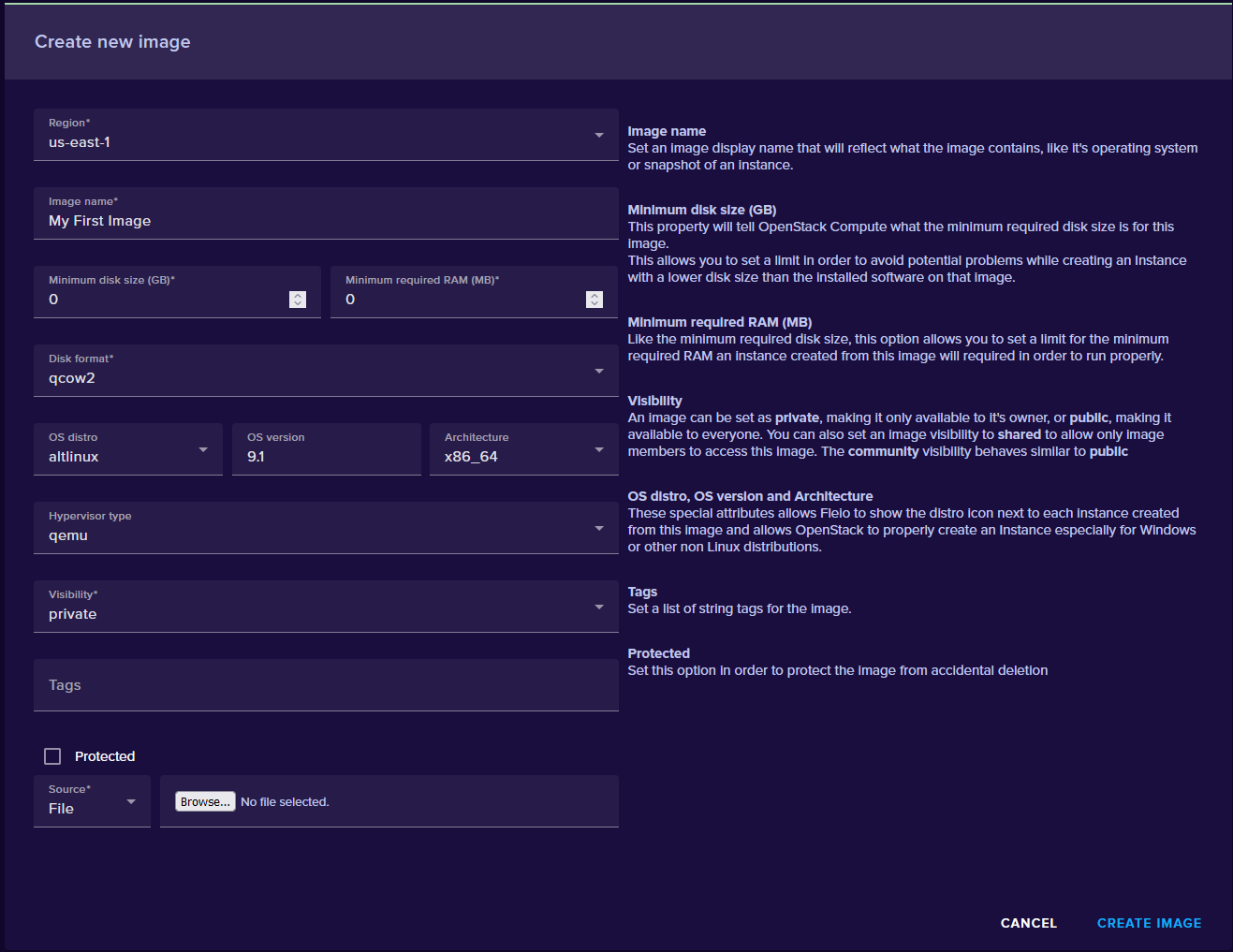 To upload an image, you will need to have an image file downloaded, or a link to where you can download one. This can be done from Cloud -> My Images