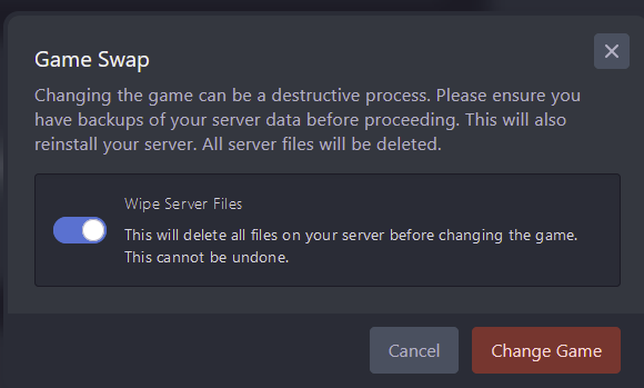 Game Swap is an AleForge Panel exclusive feature that allows our customers to switch their game servers between any of our hosted games. Combined with Server Splitter customers can run multiple servers of different games off of one plan.