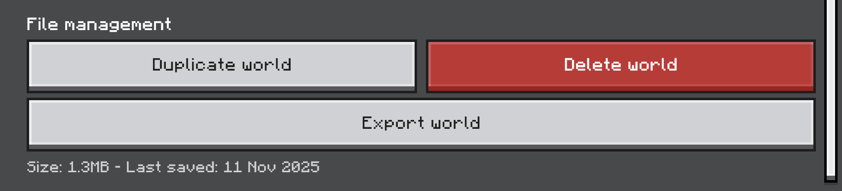 Export Worldand save your world as an.mcworldfile on your computer. We’ll need this later.