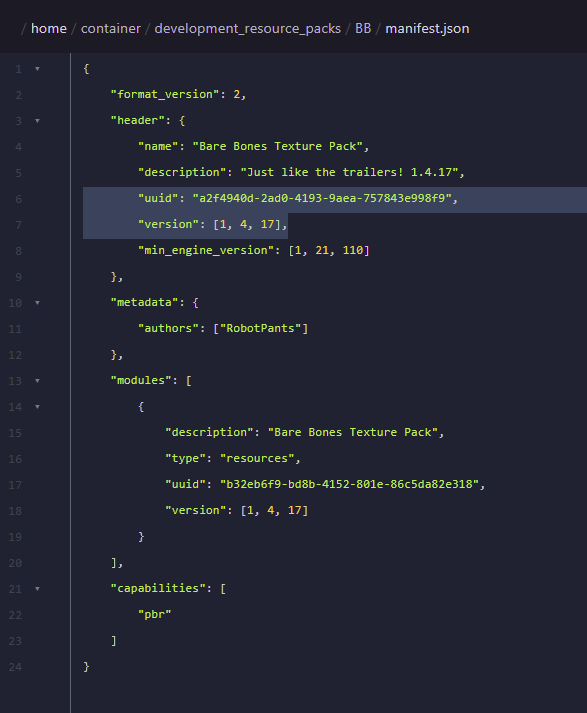 manifest.jsonand note theUUIDandVersionkeys under theheaderobject as we will need these later.