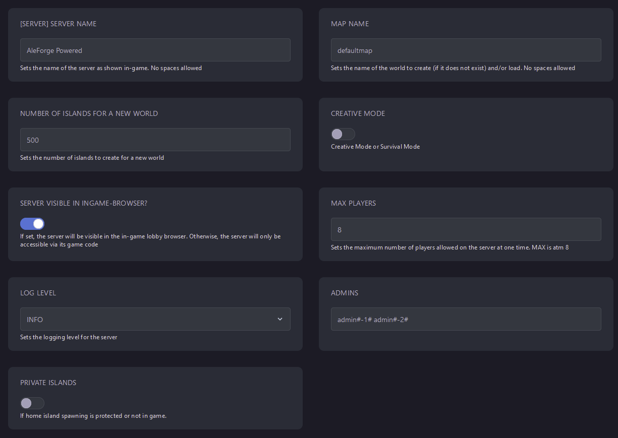 Startup - Here, you can find all the parameters you can adjust for your Aloft server. Edit one and restart the server, and it will take effect.