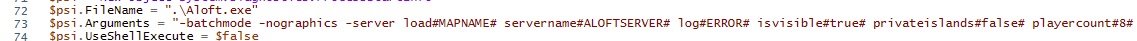 AloftServerNoGuiLoad.ps1with the text editor of your choice - Edit line 73 to make adjustments to the game config. You will want to edit the numbers/text between the two # symbols