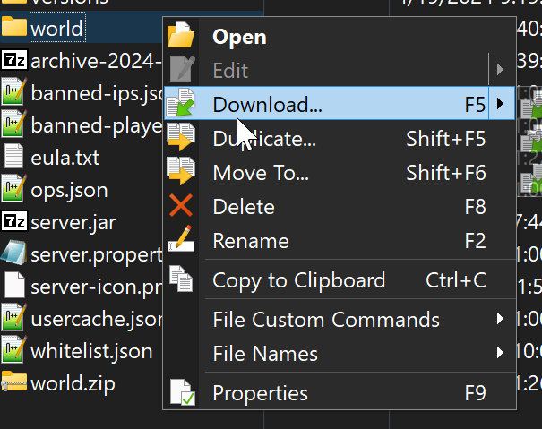 worldbut may be different if you changed the name of your world. - Move your world to your computer. In WinSCP you can do this by right clicking the file and selecting download