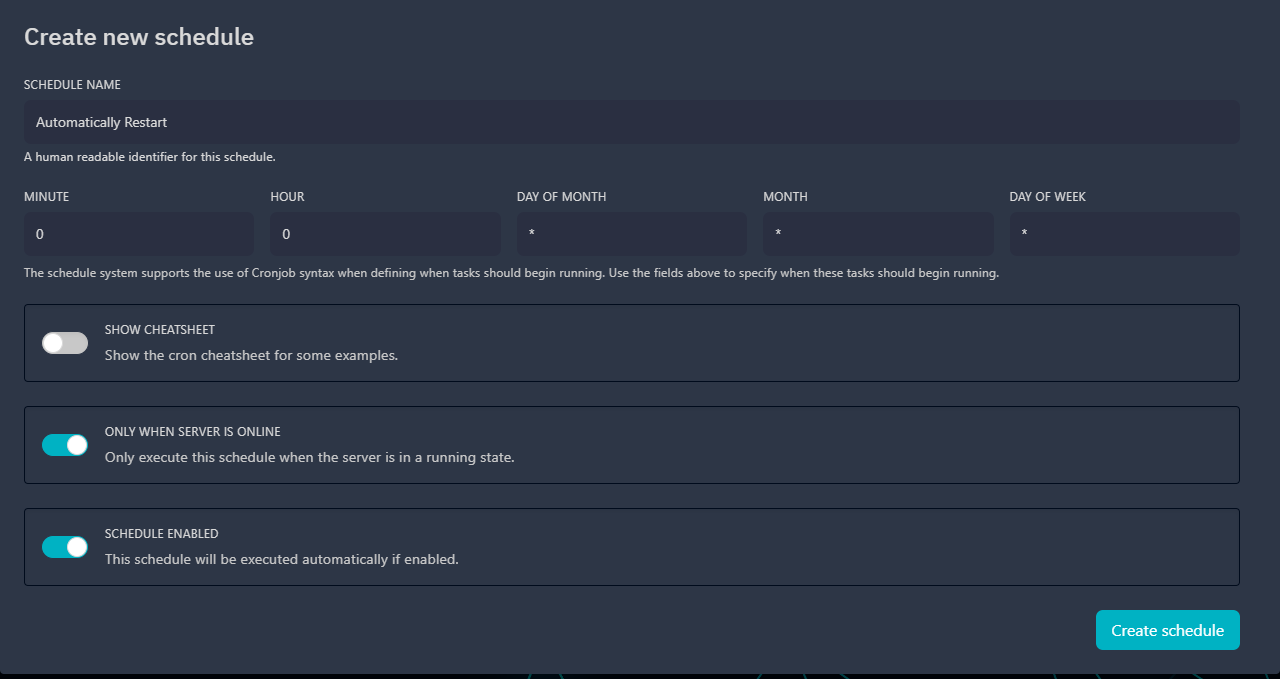 Create Schedule. To restart at midnight UTC, set the Cronjob timer to 0 0 * * * - Click