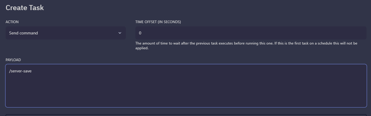 Then Create Task and set up the Send Command payload to be /server-save