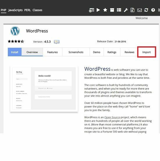 3: Click on the Import tab on the WordPress Softaculous page.