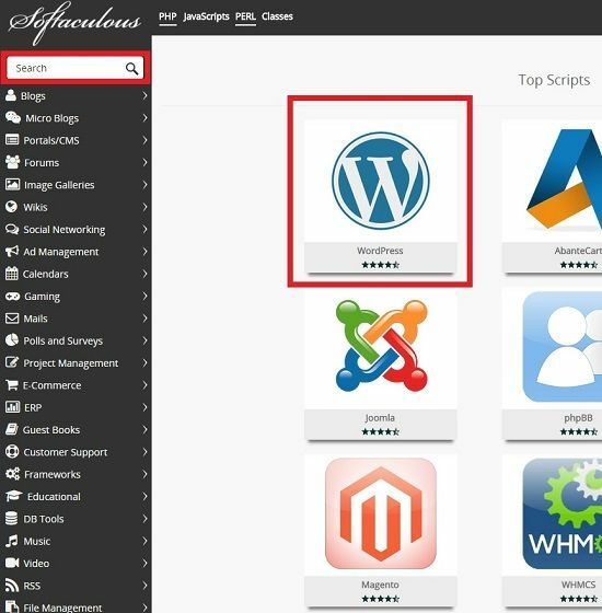 2: Navigate to the WordPress Softaculous page by either searching for it in the top left bar or opening it from among the top scripts.