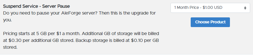 We offer a Server Pause product if you want to pause your server to take a break from the game and return later. When you pause your server, you cannot start or join your server. You will only have access to the files for your server through the AleForge Panel. The Server Pause does have a cost because your server still uses storage on our servers, and storage is, unfortunately, not free. Even though there is a cost, it is much lower than paying for memory and CPU, which are the most expensive resources on our hardware.