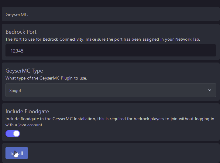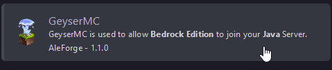 - Your server will now be setup to use GeyserMC! In order for Bedrock players to connect to your server, they will have to use the port set during the GeyserMC configuration. e.g. play.aleforge.net:12345
