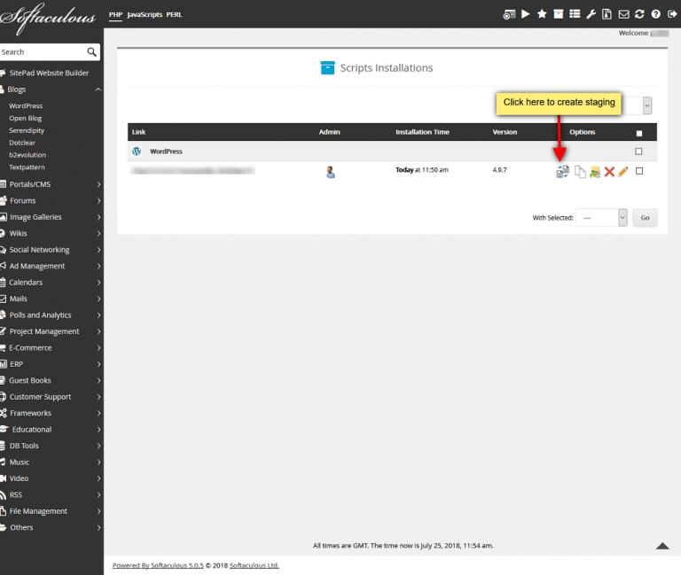 Choose the installation for which you want to create a Staging copy. Click on the Create Staging icon as shown in the screenshot below