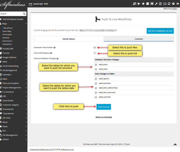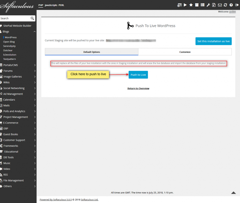 Once you have decided what changes you want to Push to your live website, hit the Push to Live button. That’s it!Let Softaculous do the hard work. The Success message will appear and you can log in to your production website and check if everything works fine.We hope this feature helps you save time and hassle in managing your staging and live installations.