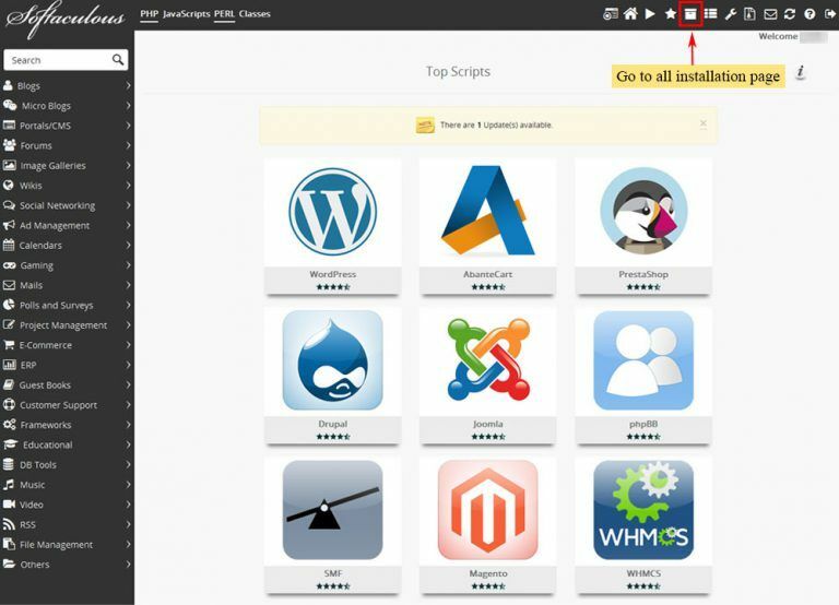 - Go to your panel (e.g. cPanel’s URL will be https://domain.com:2083) and log in with your credentials- Click on the Softaculous Icon or Link- This will take you to Softaculous Enduser Panel- Go to the Installations page as shown in the screenshot below